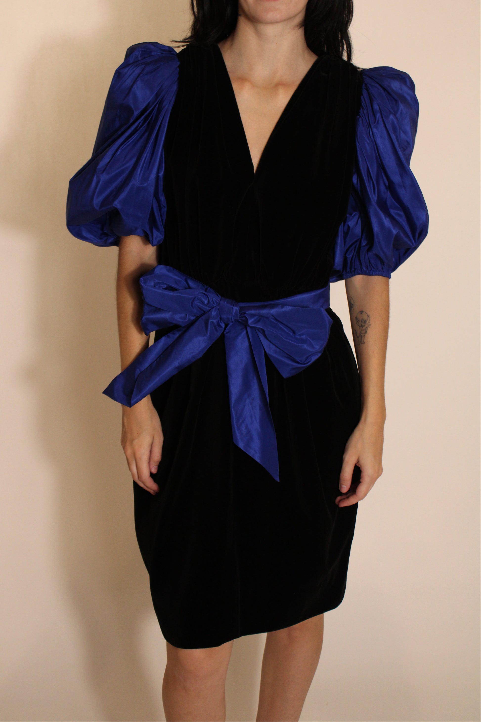 Saint Laurent Black 80s Dress With Blue Sleeves & Bow